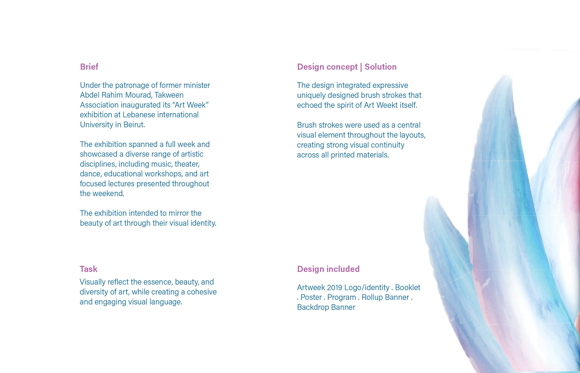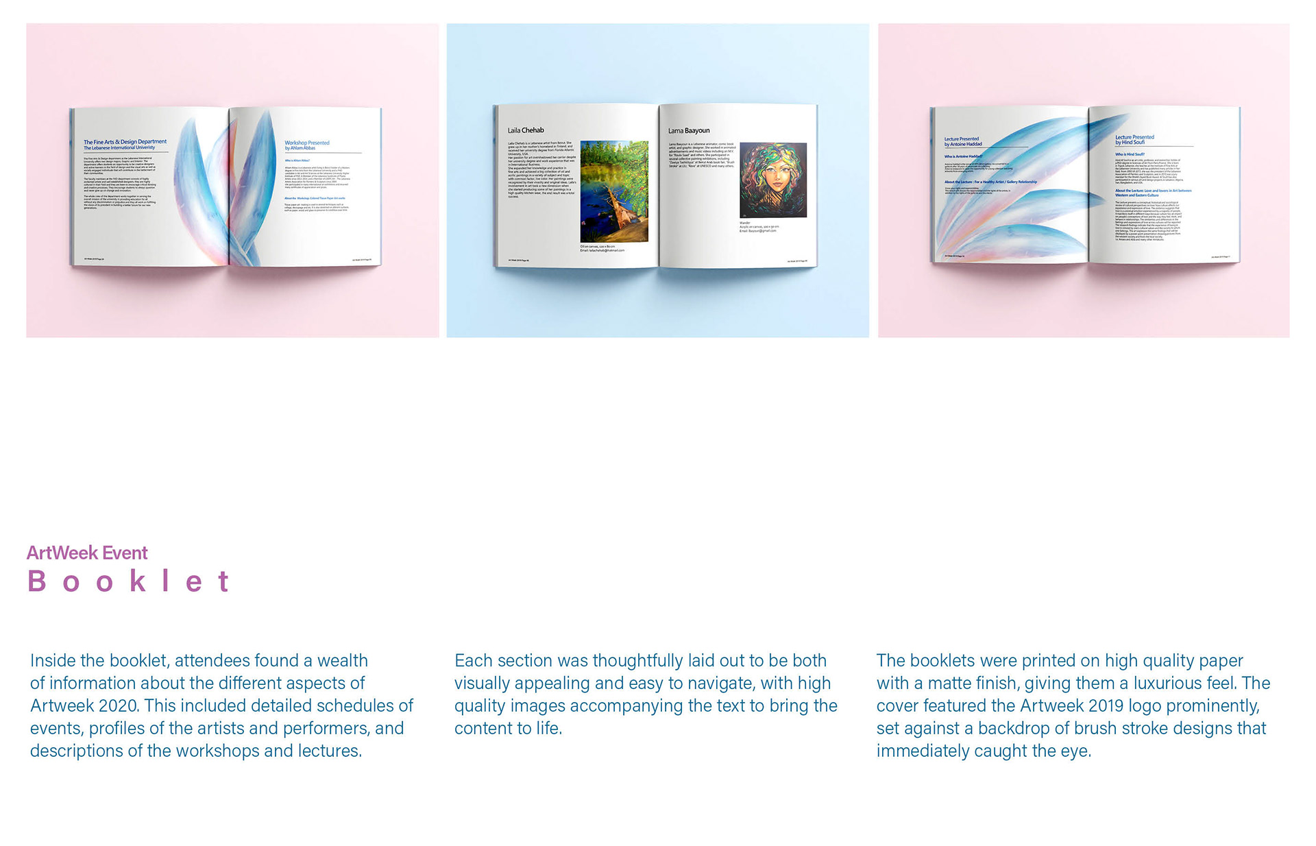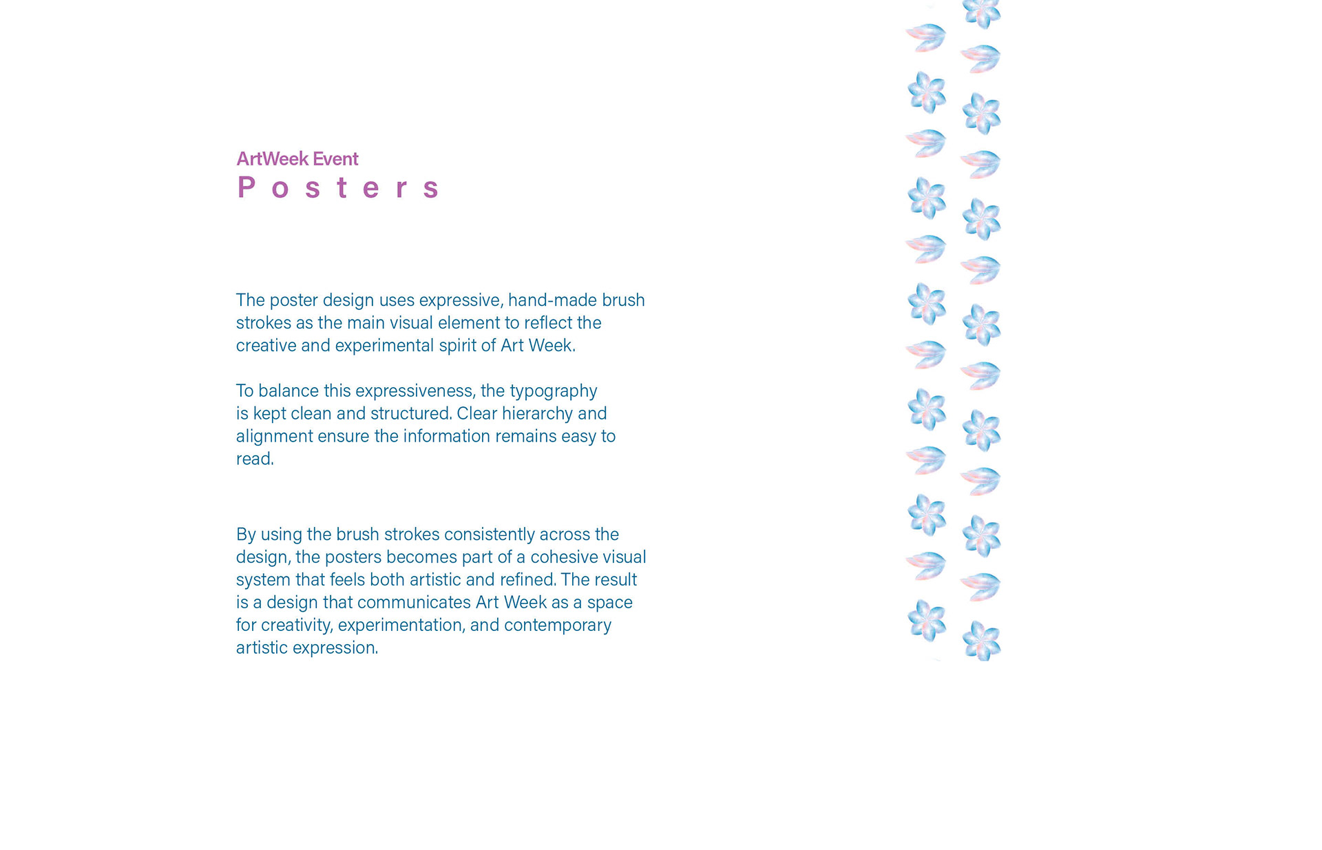 An editorial booklet and visual identity for Art Week, Aiming to combine expressive, brush strokes with a clean, structured layout.